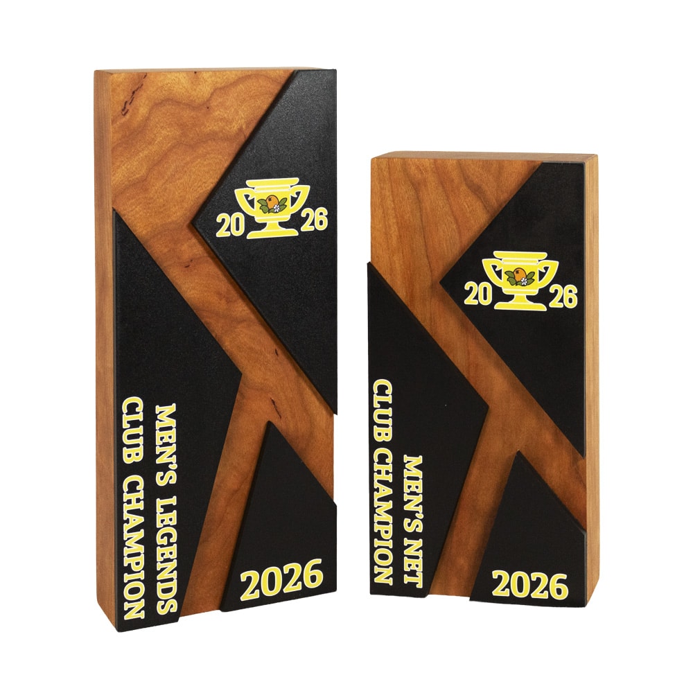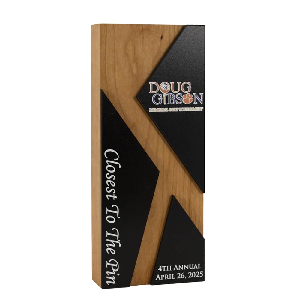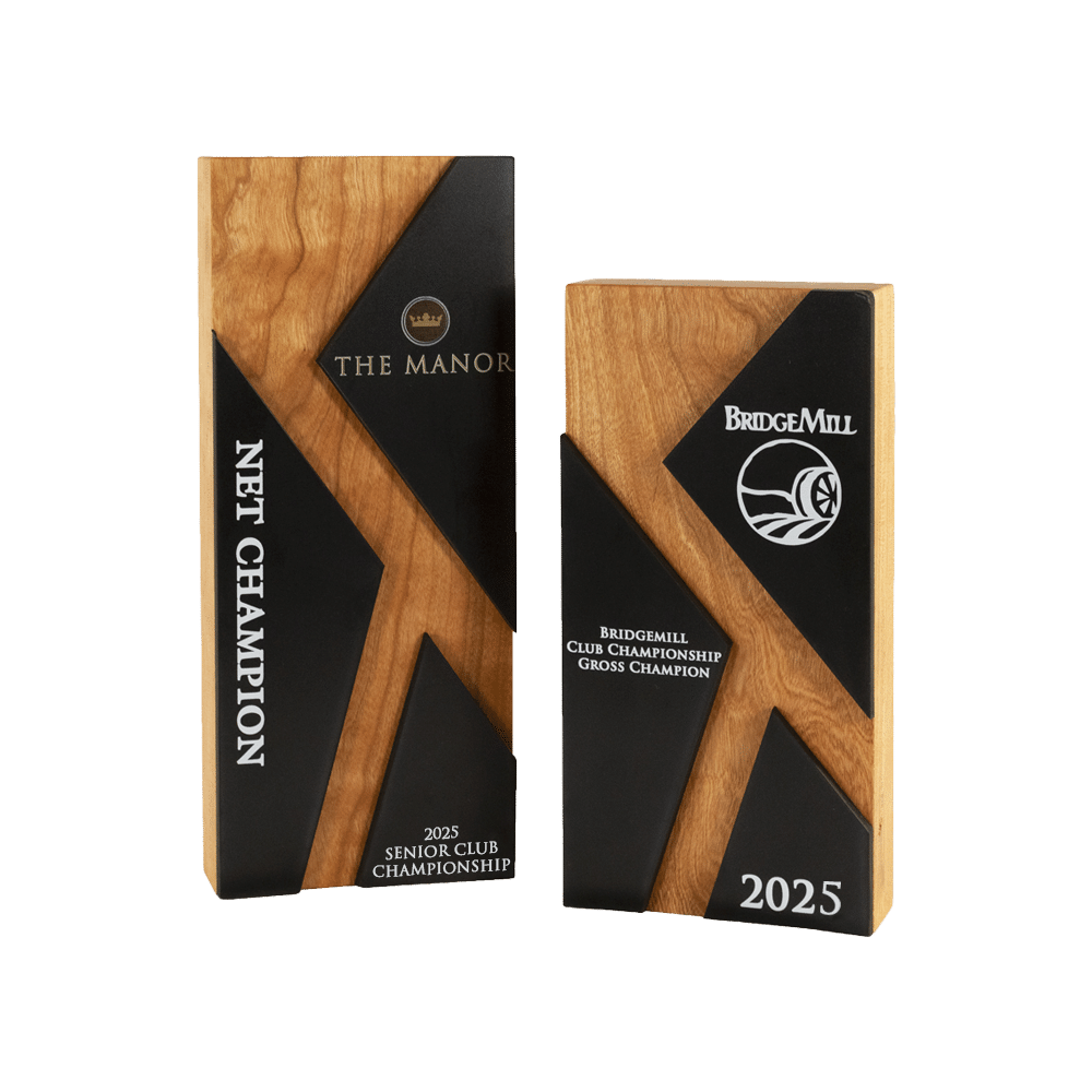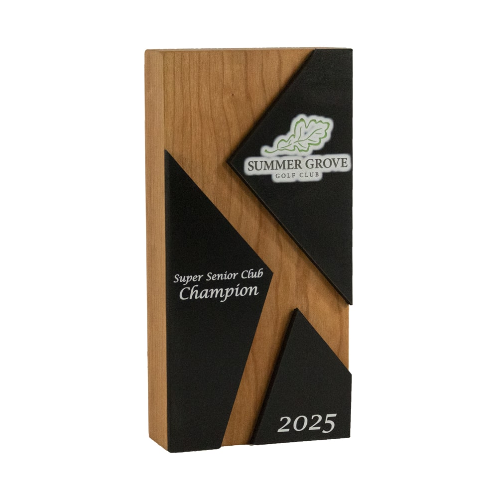 This award is a distinctive rectangular award features three scattered triangular black acrylic pieces, offering a modern touch and a dynamic visual contrast. Each acrylic piece can be custom UV printed with golf clubs’ logos or personalized text, making this award a unique and memorable recognition of excellence.