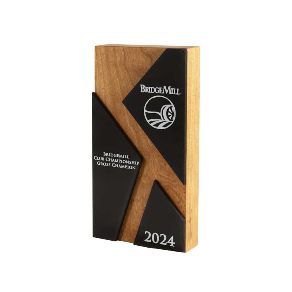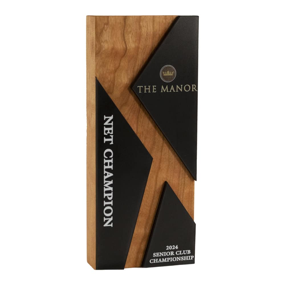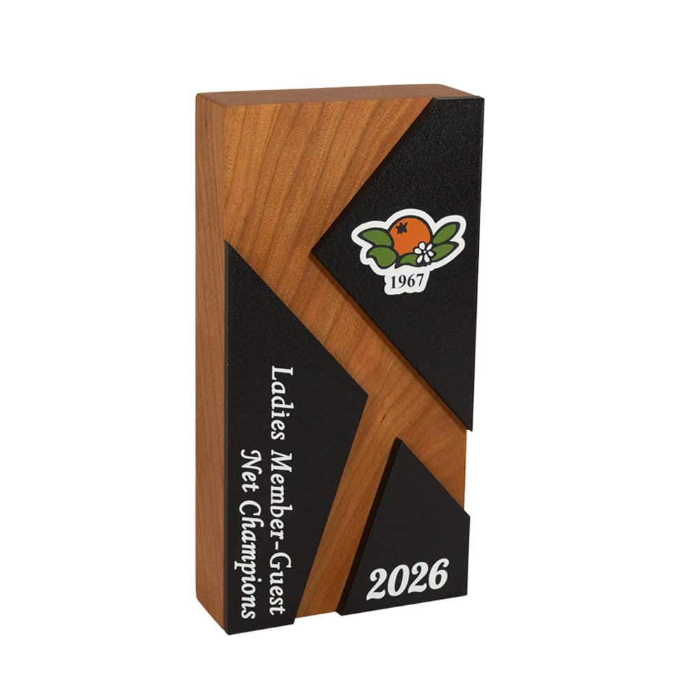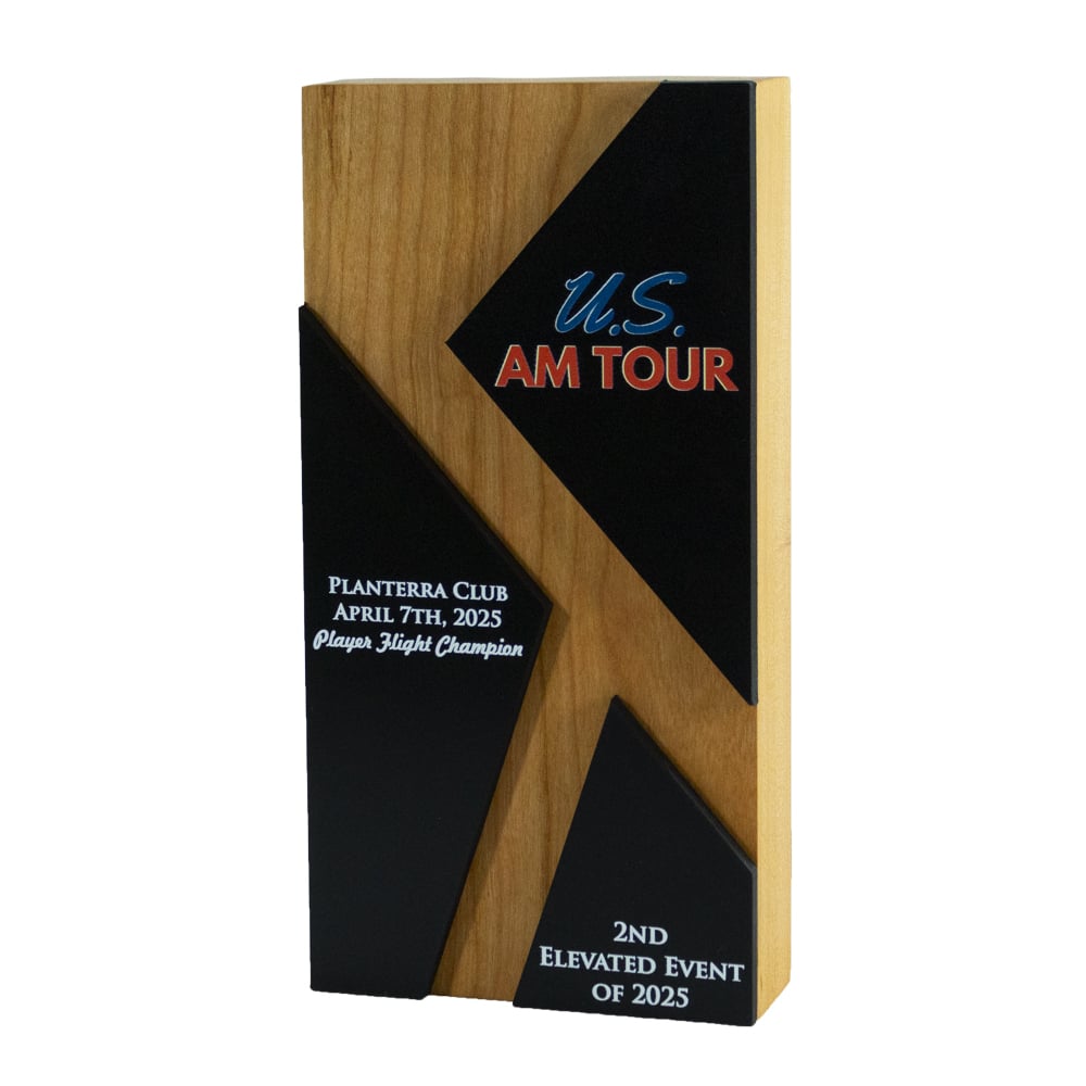 This award is a distinctive rectangular award features three scattered triangular black acrylic pieces, offering a modern touch and a dynamic visual contrast. Each acrylic piece can be custom UV printed with golf clubs’ logos or personalized text, making this award a unique and memorable recognition of excellence.