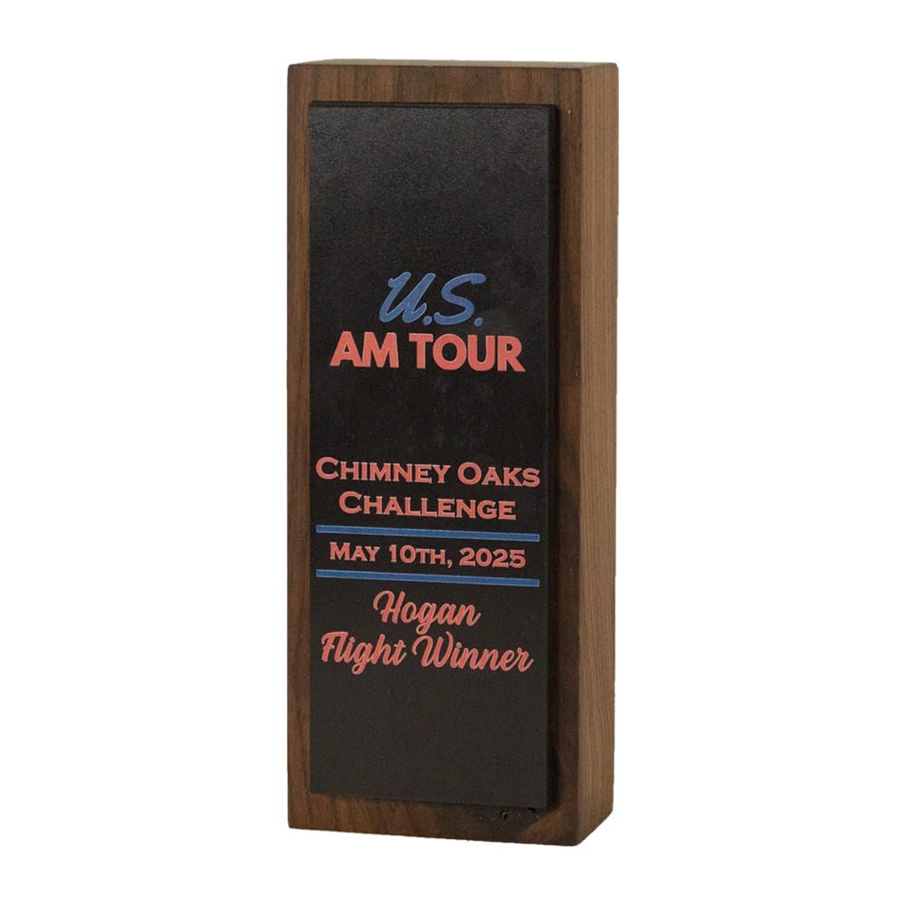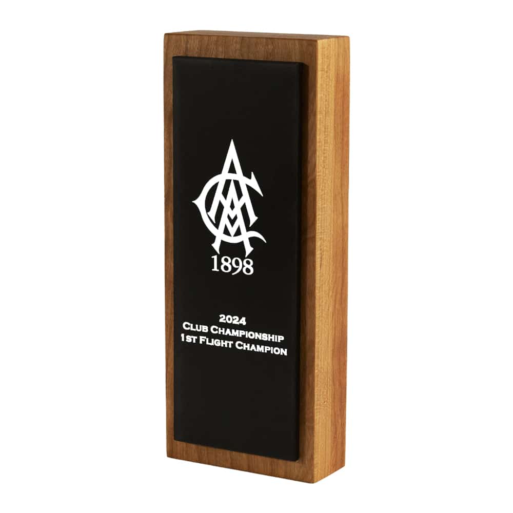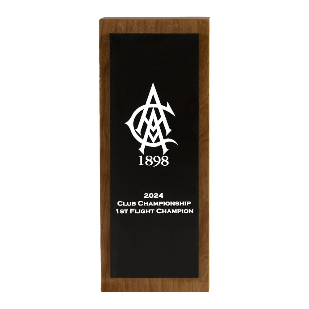Crafted from elegant 2-inch cherry wood, this award features a classic rectangular shape that exudes timeless sophistication. Complementing the warm, rich tones of the cherry, a sleek black acrylic panel is seamlessly integrated, offering a modern touch and a versatile surface for custom UV printing. Personalize this award with golf clubs’ logos or custom text to create a meaningful tribute to exceptional accomplishments.