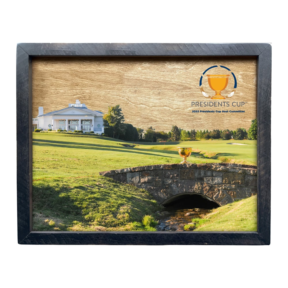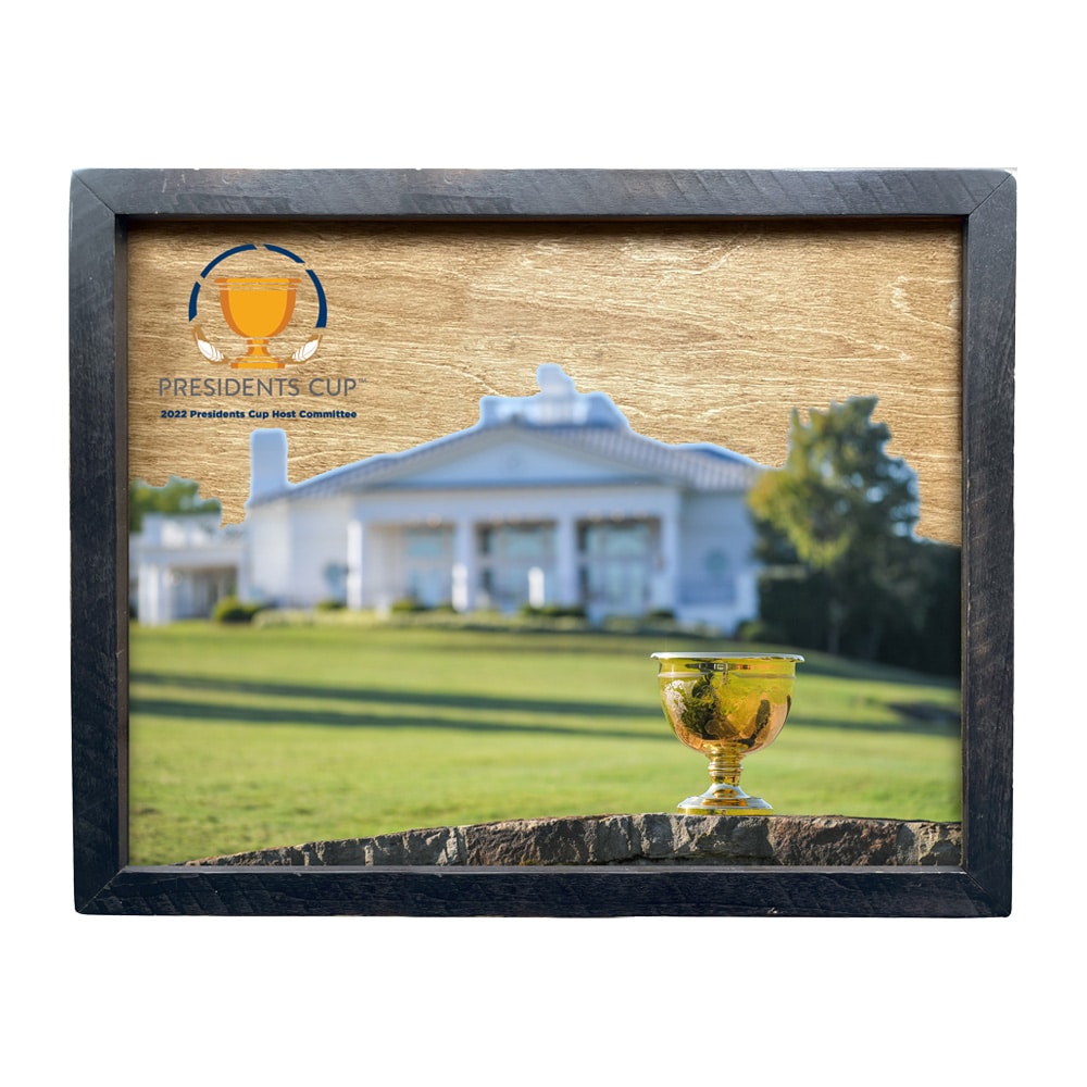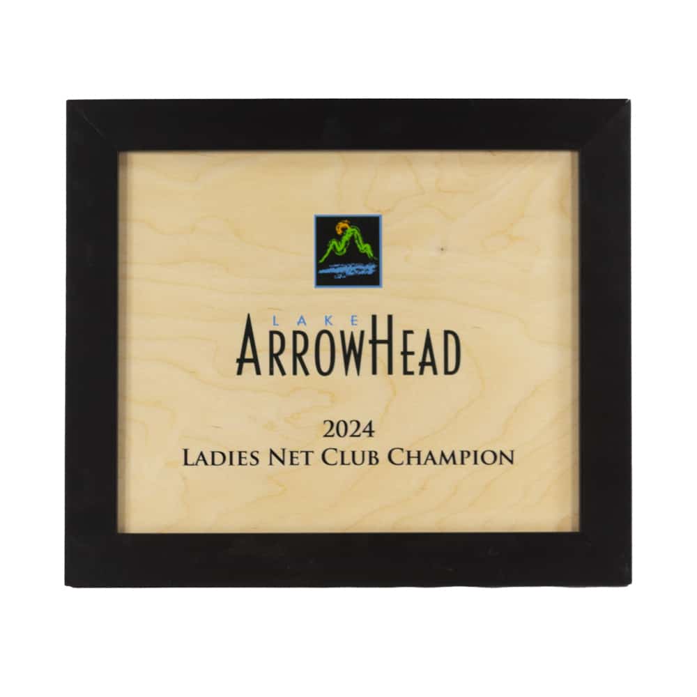 Birch background that is UV printed with your club’s logo, and full color image and tournament text and wrapped in a black painted pine frame.