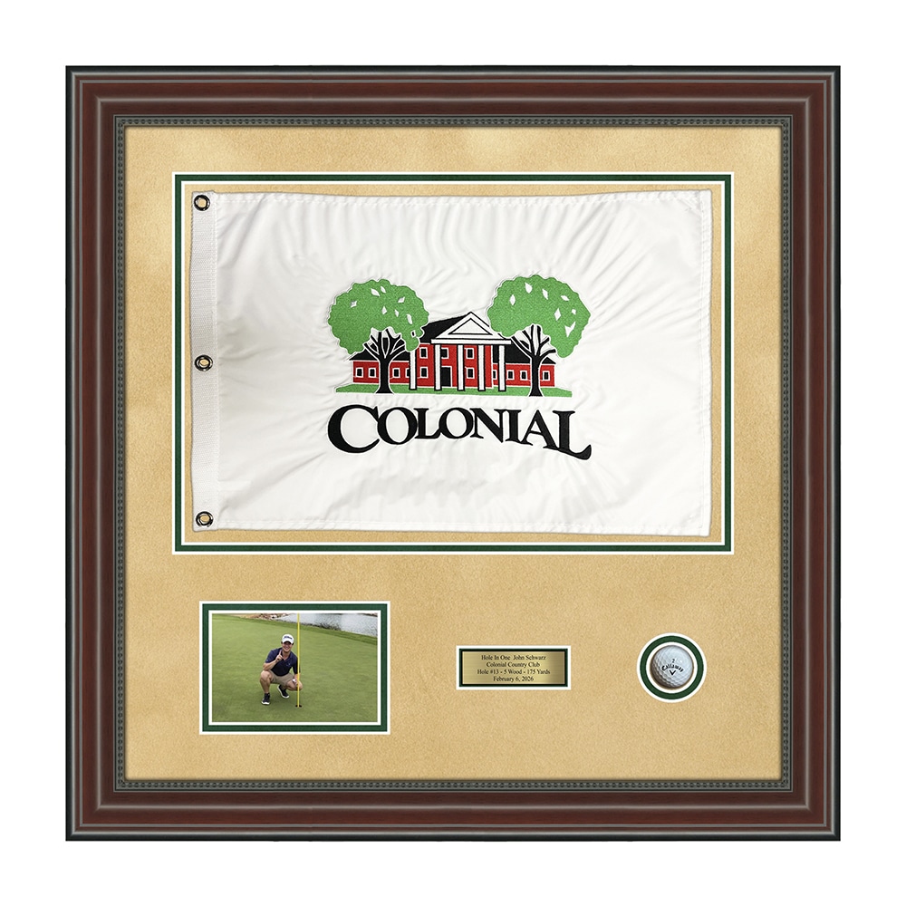 Designed to showcase a commemorative flag—embroidered, custom-provided, or sublimated—along with the original golf ball, a scorecard or image, and an engraved plaque, this display brings every detail of the moment together in one striking presentation. Luxurious suede matting adds depth and contrast, while the durable poly frame delivers a clean, classic finish. Measuring 30″ x 30″, this shadowbox creates a bold, lasting tribute worthy of a once-in-a-lifetime accomplishment.