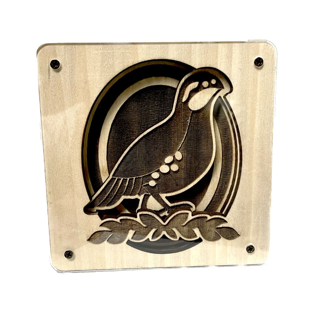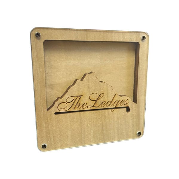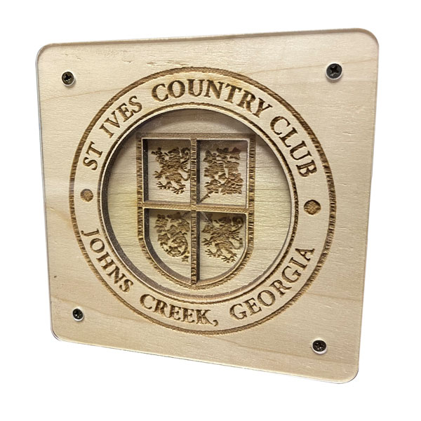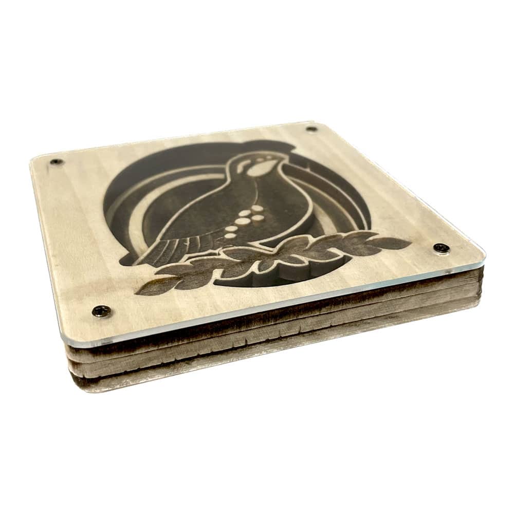 Fully custom wooden coasters. The 3D design is achieved by using up to 3 layers of wood. Layers are glued together and finished with a layer of clear acrylic secured with screws.