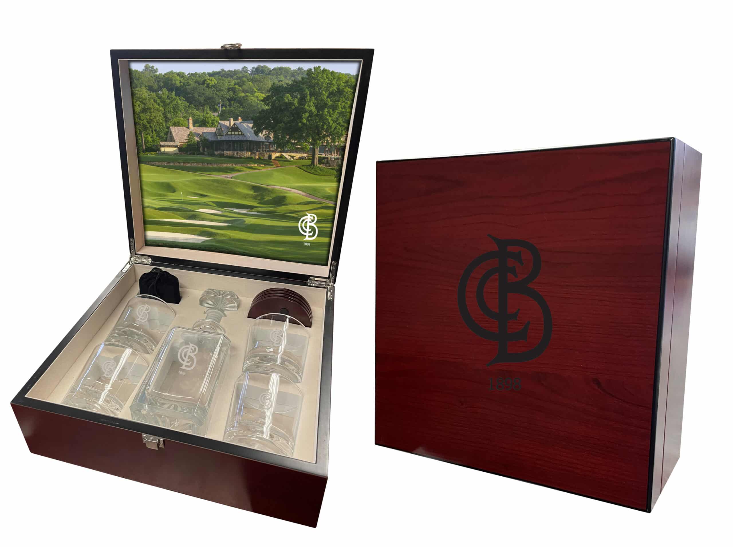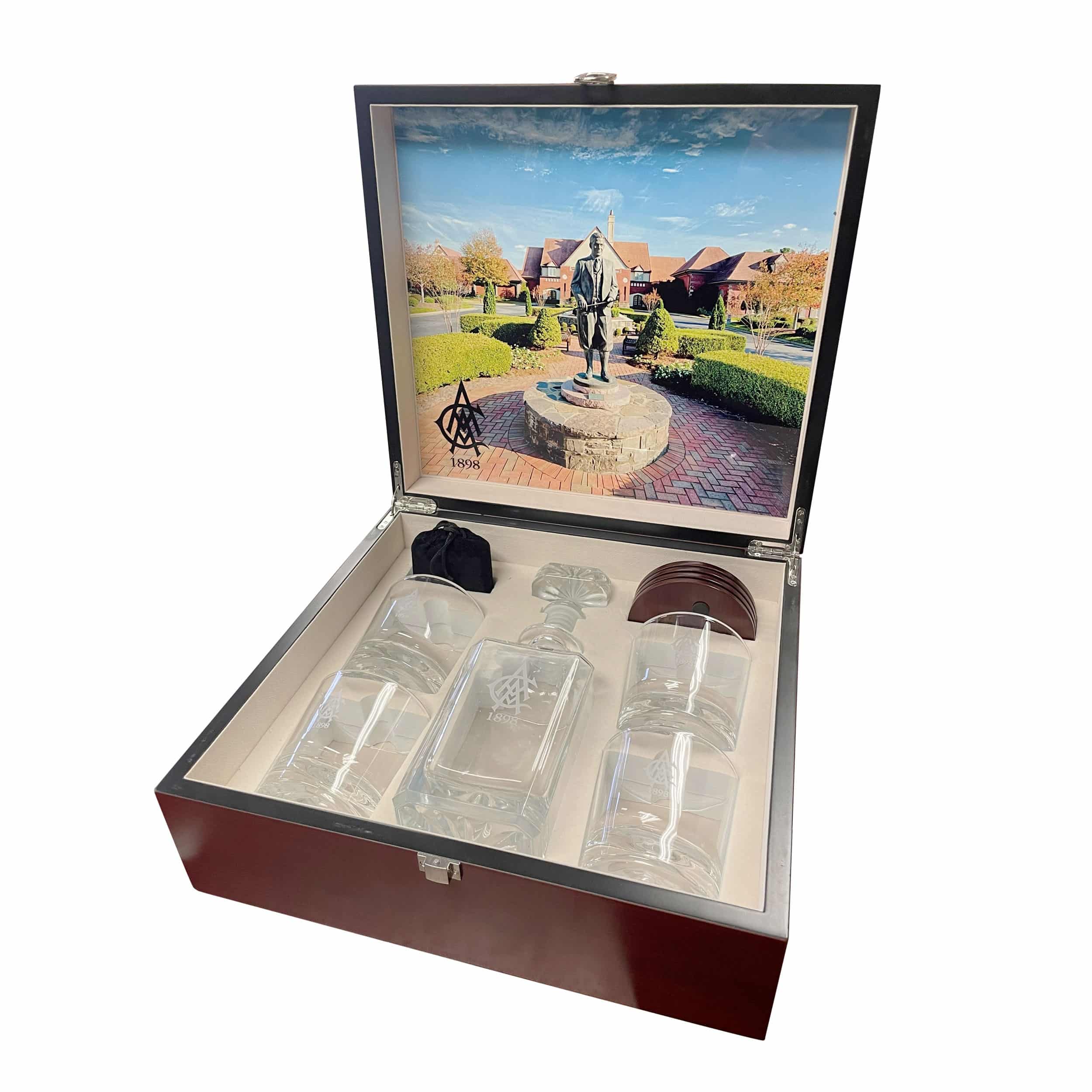 4 Rocks glasses, 1 glass decanter, 2 wooden coasters, and a set of whisky stones set in a high end cherry box.