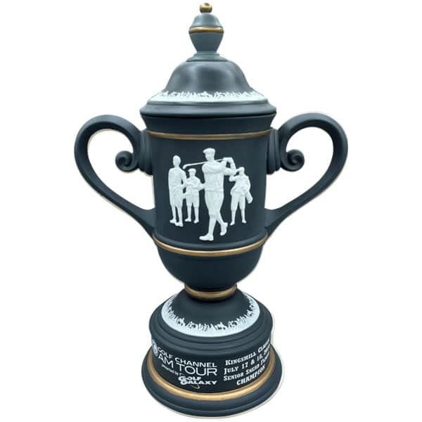 Classic trophy design. Handcrafted ceramic trophy with removable lid. Sculpted raised figures. Club logo and text engraved.