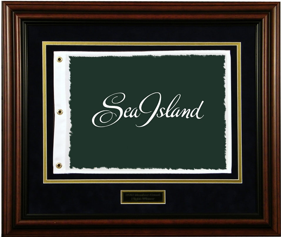 Framed white flag with full color course image or club logo with suede matting and a 2″ frame