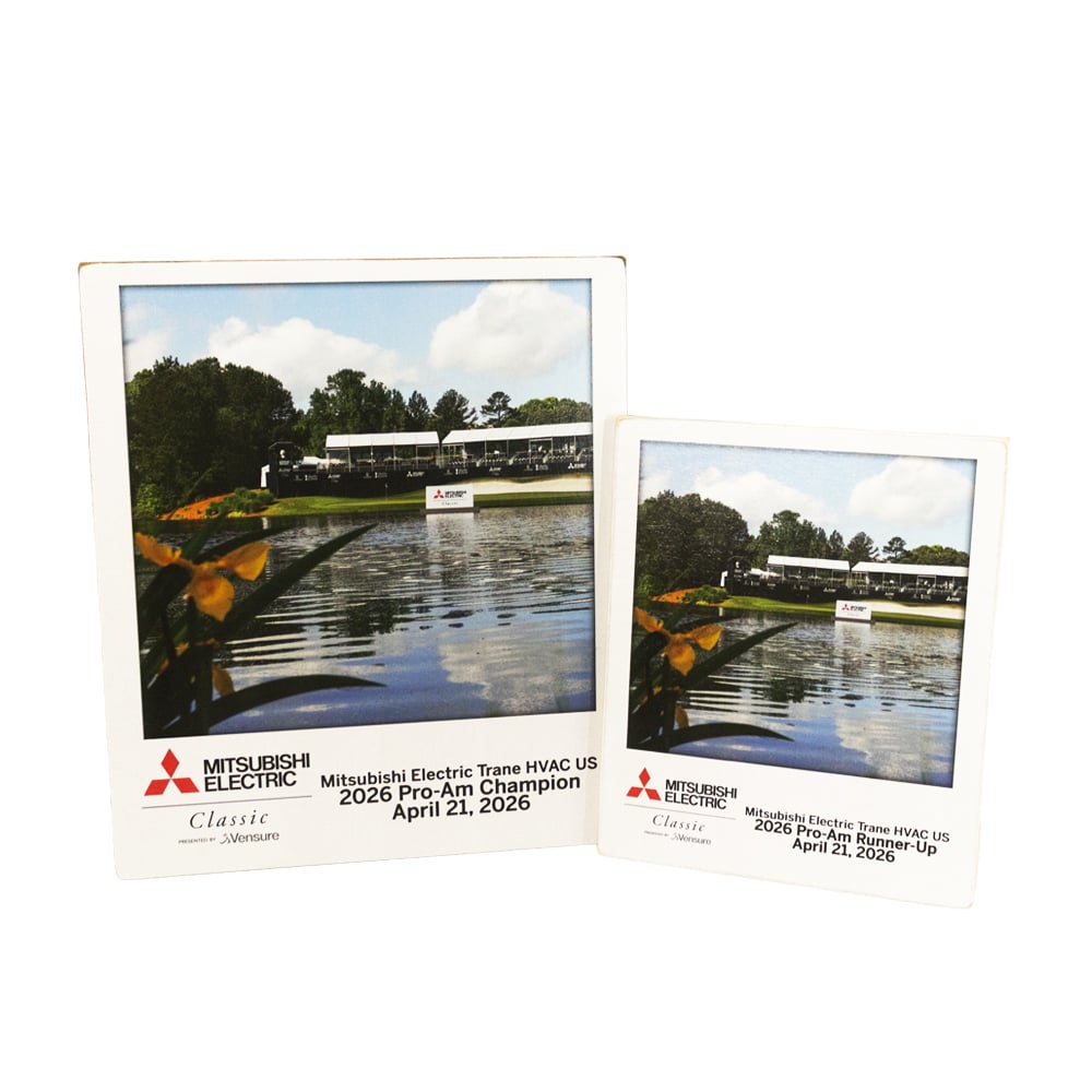 The Polaroid is a unique and elegant tribute, crafted from high-quality poplar wood and designed to resemble a classic Polaroid picture. Featuring a UV-printed image along with custom text and logos, it’s the perfect way to commemorate any golf championship. The natural wood base adds a touch of sophistication while highlighting the craftsmanship of the game.