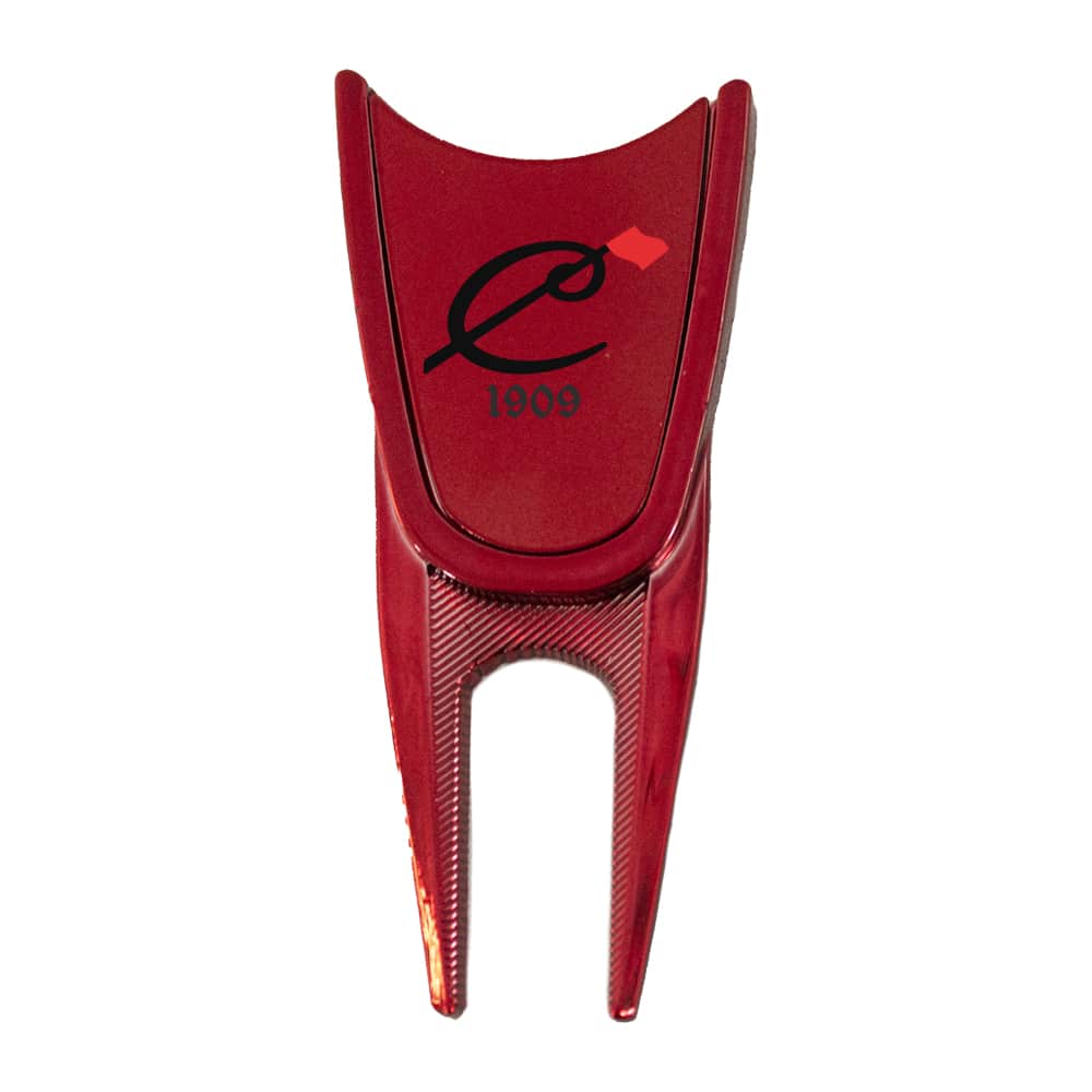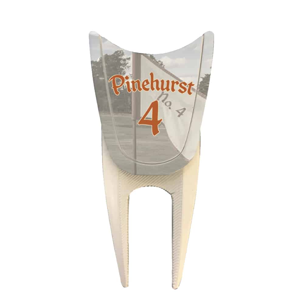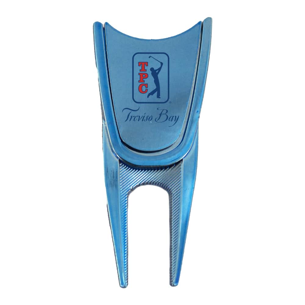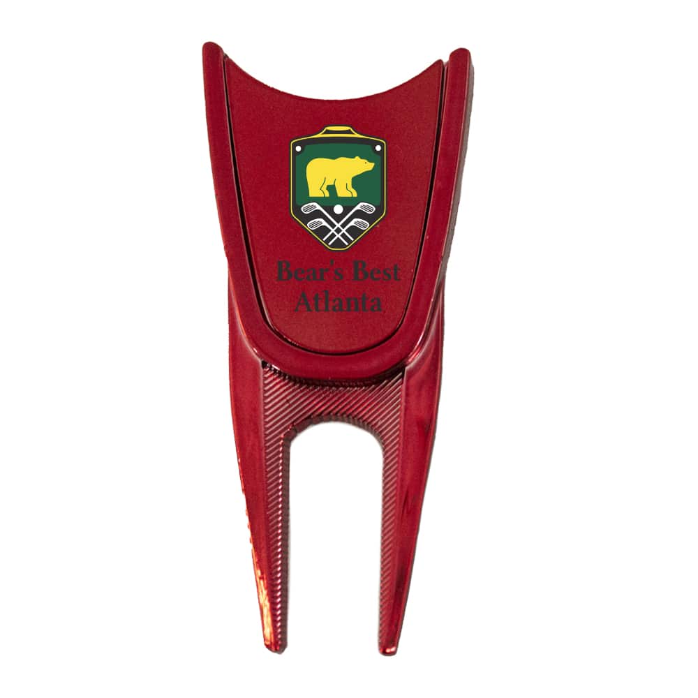The tuxedo track divot tool features an elegant tuxedo bow design, with a custom UV-printed logo on the magnetic ball marker. This stylish and functional tool helps repair divots while offering a personalized touch for a polished, professional look on the course.